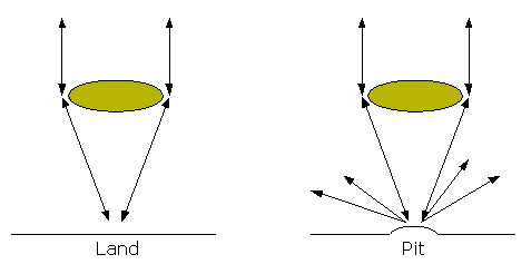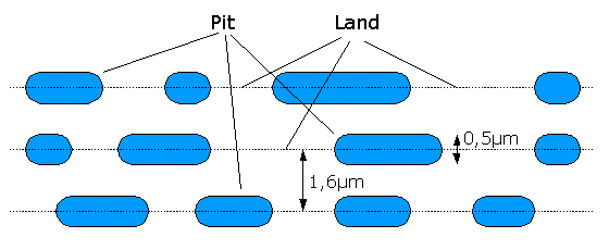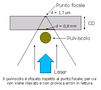I dati Il sistema di immagazzinamento dei dati sul Compact Disc è piuttosto semplice nelle sue caratteristiche essenziali. Il CD è un disco in policarbonato, ricoperto di un sottile strato di alluminio e da una pellicola protettiva, sulla quale viene poi applicata l'etichetta. I dati sono scritti sul disco in policarbonato. Le informazioni digitali, come ormai quasi tutti sappiamo, sono rappresentabili nella forma binaria come successioni di due sole cifre: vengono in genere utilizzzati lo 0 e l'1 come cifre rappresentative, ma sappiamo che per l'immagazzinamento o la trasmissione di dati - ivi inclusi i dati relativi all'audio - si utilizzano vari tipi di informazioni variabili tra due valori: un circuito chiuso o aperto, una tensione più bassa o più alta, ecc. Nel caso del CD vengono utilizzate le increspature del supporto, in modo che ad un'increspatura sia assegnato, ad esempio, un valore 1, e ad una pianura un valore 0 (in realtà è leggermente più complesso: all'inizio di un'increspatura, si ha un valore 1; si ha poi un 0 ogni tot. di spazio, finchè non cessa l'increspatura; qui si ha di nuovo un valore 1, e poi uno 0 ogni tot. di spazio in cui continua la pianura; e così via - il sistema è spiegato con precisione più avanti). Vediamo meglio come questo avvenga. Analogamente al disco in vinile, i dati sul CD vengono disposti a spirale, in modo che l'intera superficie possa essere percorsa di seguito, ma, al contrario del vinile, che inizia dal bordo esterno, il CD contiene dati a partire dal bordo interno. Il foro centrale misura 15 mm, la traccia di partenza si trova a 15,5 mm dal foro centrale (sul cerchio di diametro di 46 mm), l'ultima traccia si conclude al massimo sul cerchio di diametro di 116 mm, mentre il diametro complessivo è di 120 mm. ![]() Con queste caratteristiche il CD audio contiene fino a 74 minuti di musica (anche se, modificando leggermente gli standard CD, si può arrivare a tempi che superano gli 80 minuti), con un segnale quantizzato a 16 bit, stereo, alla frequenza di campionamento di 44100 Hz. Le informazioni sono contenute in piccole depressioni (pits - alla lettera, pozzi) impresse sulla superficie metallica di uno strato riflettente. Se ogni pit venisse ingrandito alle dimensioni di un granello di riso, il diametro del CD misurerebbe quasi un chilometro. Gli spazi pianeggianti tra un pit e l'altro vengono detti lands (pianure). Ogni bordo di un pit rappresenta un 1 binario; le aree pianeggianti tra un pit e l'altro o all'interno di un pit rappresentano uno 0 binario. I pits - come abbiamo visto - sono allineati in una spirale che parte dall'interno del disco e va all'esterno, coprendo 22.188 rivoluzioni sulla superficie del CD. I pit sono larghi circa 0,5 µm, lunghi da 0,83 fino a 3,55 µm, profondi tra 0,1 e 0,2 µm. Lo spazio tra due tracce è di circa 1,6 µm. ![]() La spirale è lunga circa 5 km. La lettura Il CD è un supporto ottico. Ciò significa che la lettura dei dati avviene tramite un fascio di luce. Infatti è un pick-up ottico che legge i dati: un piccolo raggio laser viene emesso dal dispositivo di lettura e guidato, attraverso un percorso ottico, sulla superficie del disco. La superficie, investita dalla luce, nel caso di una pianura ne riflette la gran parte nella direzione di provenienza, mentre nel caso di una protuberanza ne riflette gran parte in altre direzioni. ![]() La luce riflessa è individuata dal pick-up e i dati sono trasformati, da modulazione luminosa, in modulazione elettrica. La lettura in realtà avviene dal lato opposto al quale i dati sono stati impressi, è per questo motivo quindi che il dispositivo di lettura rileva in realtà non degli avvallamenti ma delle gobbe (bumps, cunette). Il diametro del raggio laser emesso è di circa 1 mm, ma la lettura dei dati sfrutta l'indice di rifrazione del substrato in policarbonato; ciò aiuta a ridurre la dimensione del fascio laser sulla superficie dei dati a circa un millesimo della sua dimensione originale (1,7 µm), permettendo così alle impurità sulla superficie esterna di venire ridotte e sfocate, in modo che non provochino errori di lettura. ![]() Un'altra parte delicata del procedimento di lettura consiste nel mantenere il disco nel fuoco del raggio laser e su un piano che permetta al raggio di seguire la traccia che sta leggendo senza spostamenti laterali. Il metodo comunemente usato è quello di utilizzare non uno ma tre raggi, producendone altri due per diffrazione da quello generato, di cui uno centrale che legge la traccia e due laterali che percorrono lo spazio tra le tracce, il quale, essendo pianeggiante, funge da guida al meccanismo di posizionamento. La velocità Per ultimo, dedichiamo uno sguardo alla velocità del compact disc in lettura. La rotazione può avvenire secondo due sistemi in particolare: CLV - ossia Constant Linear velocity, velocità lineare costante, o CAV - ossia Constant Angular Velocity, velocità angolare costante. Il sistema più vecchio, quello applicato sui lettori CD di prima generazione, era il CLV: questo garantiva una velocità di trasferimento dei dati di 150kB/sec, che è la velocità che poi è stata utilizzata come unità di riferimento, e quindi indicata nei lettori CD-ROM come 1x. Per il sistema CLV, è necessario che la velocità di lettura sia linearmente costante, e quindi il disco deve rallentare quando il laser si trova nelle zone più esterne. In questo sistema i dati vengono inviati ad un buffer (memoria di transizione) dal quale vengono poi restituiti con una spaziatura nel tempo garantita da un oscillatore interno. I lettori CAV furono introdotti negli anni '90 dalla Pioneer. Con questo sistema, la velocità di rotazione del disco è costante, per cui è la lettura che avviene con un tasso variabile. Questo sistema non è di particolare miglioramento per la lettura dei CD Audio, ma è stato fondamentale nello sviluppo della lettura e scrittura dei dati nei CD-ROM, che possono ora raggiungere elevate vel
