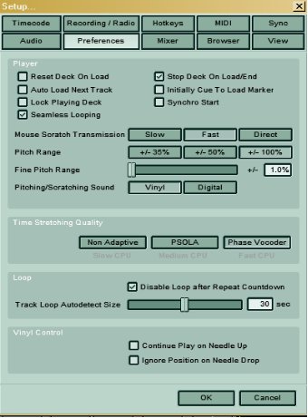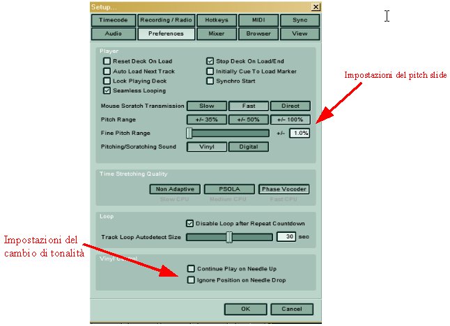 Il coefficiente di sincronia è indicato dalla barra a lato. Se è assente e lampeggia un trattino blu, allora il tutto è a tempo; se vi è una barra arancione o sopra o sotto il trattino centrale, allora il tempo sarà tanto più fuori fase quanto maggiore sarà lunghezza della barretta arancione (che d'ora in poi chiameremo indicatore di sincronia). Mentre due pezzi vanno, possono facilmente esserci dei locali cambi di tempo, pertanto basterà ripremere SYNC per riallinearli e vedere scomparire la barra arancione, ma attenti, l'effetto non è immediato, per meglio simulare l'effetto della mano del DJ sul piatto che lo rallenta o lo velocizza di poco dovremo tenere pemuto il tasto sino alla completa sparizione della barretta. Al contrario i due tasti grossi + e – servono per mandare fuori fase le battute dei due brani. Su questo mi fermo un attimo, spiegando la differenza tra fuori fase e fuori tempo: fuori tempo è quando il numero di BPM è differente, fuori fase è quando i BPM sono uguali ma la battuta non è allineata. Nella pratica si traduce che le casse di due pezzi fuori tempo anche se inizialmente sofrapposte con lo scorrere del tempo si disaccoppieranno sempre più, mentre due casse fuori fase rimarranno sempre nel medesimo rapporto temporale col procedere dei brani. Quest'ultimo caso può essere un effetto voluto dal DJ, per creare particolari effetti, ma è una cosa molto difficile da gestire, pertanto se siete neofiti dimenticatevi il fuori fase, anzi cercate di evitarlo il più possibile, ma con l'andare del tempo e l'accrescersi della vostra esperienza ricordatevi di questa possibilità. Altro consiglio pratico è di non fidarvi ciecamente dell'indicatore di sincronia, alle volte con pezzi molto complessi ritmicamente può sbagliare, anche e soprattutto perchè il programma non sempre rileva correttamente il tempo del nostro pezzo. Questa osservazione mi introduce ad un'ulteriore gruppo pulsanti: ![]() Qui troviamo un pitch slide come nei piatti veri che potremo variare a nostro piacere per variare il tempo. Il range di variazione dello slide è indicato dall'impostazione settata in questo menù: ![]() Potrà essere +/- 35,50,100 %, ma consiglio 100, permette più flessibilità. Inoltre potremo settare gli step compiuti dai pulsanti + e – di fianco al pitch slide con il settaggio “fine pitch range”. Inoltre in questo gruppo comandi troviamo un riquadro con due numeri: il numero di BPM rilevato dal programma e la sua percentuale di accuratezza. Generalmente se il pezzo è molto ritmato ed ha una cassa bella “definita” non ci sono problemi e Traktor non sbaglia, se però vi sono lunghe intro senza ritmica ci potrebbe volere un po di tempo prima che compaia il numero di BPM (potrebbe pure non comparire affatto, provate a mandare in play un canto gregoriano e poi ditemi!). Inoltre se la ritmica del brano non è costante potrebbe variare di colpo il numero di BPM rilevati, in qual caso vedrete scendere di colpo il numero percentuale sotto i BPM, l'indice di affidabilità. Questo indice è dato da numerosi fattori non indicati dalla Native Instruments, ma per esperienza vi dico che non vi baderete quasi, in ogni caso se il risultato del rilevamento automatico di BPM operato da Traktor non vi dovesse soddisfare, potrete intervenire premendo il tasto EDIT, facendo comparire questa finestra: ![]() Qui potrete definire il range entro il quale rilevate le battute per minuto, potrete rilevarle manualmente premendo la barra spaziatrice in tempo con la musica o potrete imporre di rilevare valori tondi, ovvero privi di decimali, per meglio sincronizzarvi con dispositivi audio che non dispongono di tale accuratezza (mi vengono in mente le groove box, ma ve ne sono molti altri). Come ultimo gruppo troviamo un ulteriore slide di fianco a quello del pitch che, assieme ad alcuni pulsanti, regola la tonalità del brano. ![]() Noterete che questo slide si muove di comune accordo con quello del pitch, ma se premerete il tasto LOCK non lo farà più, permettendovi di variare la tonalità del brano senza alterare le battute o al contrario riportare ad una tonalità normale un pezzo di cui avete alterato le battute, questo soprattutto per pezzi con parti cantate permette di evitare il fastidiosissimo effetto “chipmans”, ovvero la voce in falsetto che si ottiene facendo scorrere più velocemente un brano (o la voce cupa se fatto rallentare). L'unico inconveniente di “lokkare” la tonalità è che questa operazione richiede molta potenza di calcolo al processore e qui la Native Instruments ci viene incontro permettendoci di settare la qualità con cui la tonalità viene modificata dallo slide. ![]() Partite dall'impostazione “PSOLA” e se variando la tonalità del brano doveste sentire crepitii o artefatti sonori scendete di qualità, altrimenti se tutto va bene provate ad imostare su “Phase Vocoder” la cui resa sonora è di molto superiore, se anche qui il suono non ha difetti siete a posto, altrimenti tornate a “PSOLA”. In ogni caso il vocoder è alla portata solo di processori relativamente recenti come P4 e AthlonXP sopra i 1800 MhZ, mentre per vecchi processori intorno agli 800 MhZ dovrete rinunciare al cambio di tonalità ed impostare su “Non Adaptative”. << Indice |