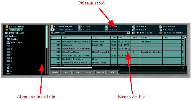 Il secondo e il terzo di questi settori possono essere esclusi a piacimento tramite la semplice pressione della “X” corrispondente situata sulla sinistra. ![]() Anche tutte le altre parti del deck possono essere “tolte di mezzo” così come anche il filtro, il browser e via dicendo, tramite la pressione delle X a fianco. Nella porzione di deck sottostante alla finestra troviamo i comandi veri e propri. La funzione di molti di essi è assolutamente intuitiva, pertanto andiamo a vedere quelli più particolari e come si usano. Carichiamo ora un brano di nostro interesse in un qualsiasi deck, per farlo lo cercheremo nel nostro HD, o conoscendone l'esatta posizione nell'albero di cartelle, o introducendo una o più parole chiave nell'apposita finestra del browser interno: ![]() Il browser appare diviso in tre sezioni: